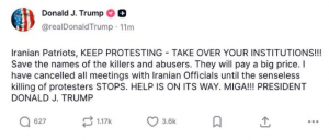 Donald Tramp Eron Islom Respublikasiga qarshi zarbalar berishni ko’rib chiqayotgan bir paytda, Eron namoyishchilariga «yordam yo’lda» ekanligi bilan navbatdagi shov-shuvli muhokamalarga eshiklarni ochdi.