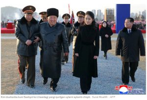 Forscha qo’y go’shtidan to’qilgan jun shlyapa, charm trench va qora shim kiygan diktator Pxenyandagi yangi osmono’par binolar oldida tartibli ravishda kvadrat shaklida joylashtirilgan ulkan auditoriyaga murojaat qildi.